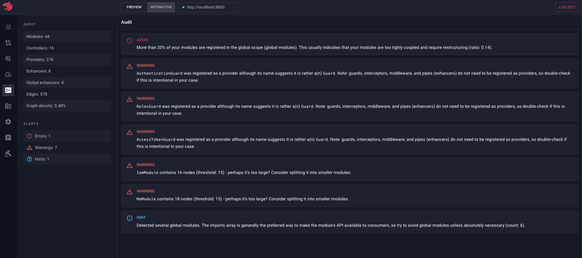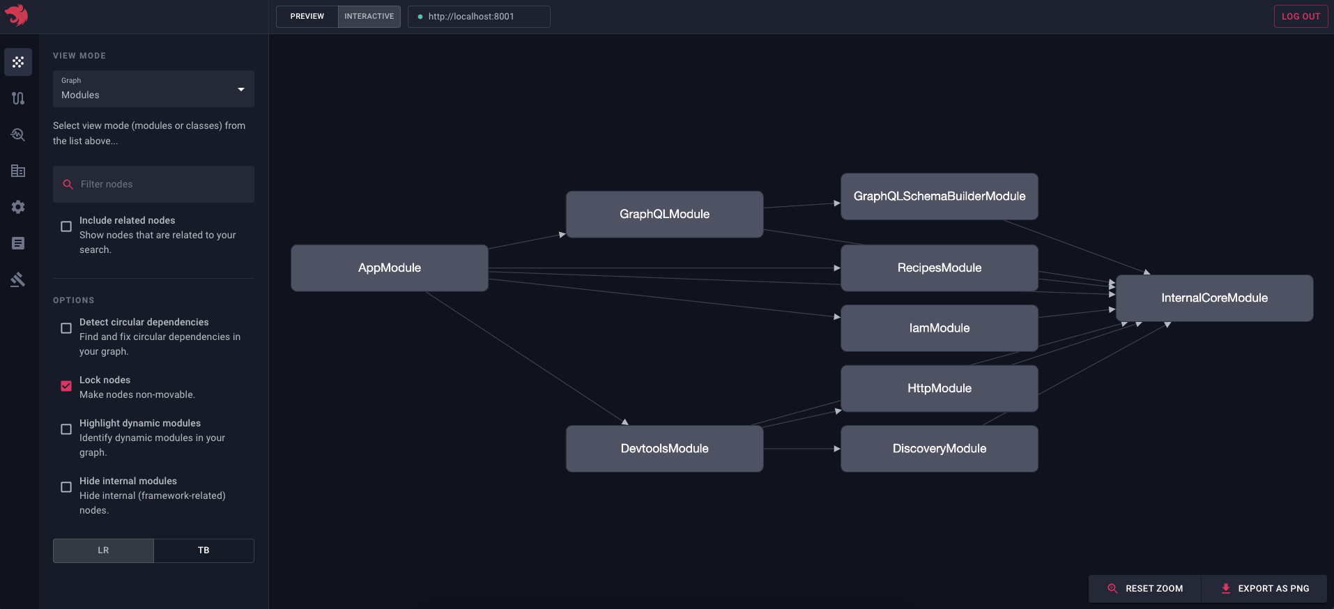 Hint As you can see on the screenshot above, every module connects to theInternalCoreModule.InternalCoreModuleis a global module that is always imported into the root module. Since it's registered as a global node, Nest automatically creates edges between all of the modules and theInternalCoreModulenode. Now, if you want to hide global modules from the graph, you can use the "Hide global modules" checkbox (in the sidebar).