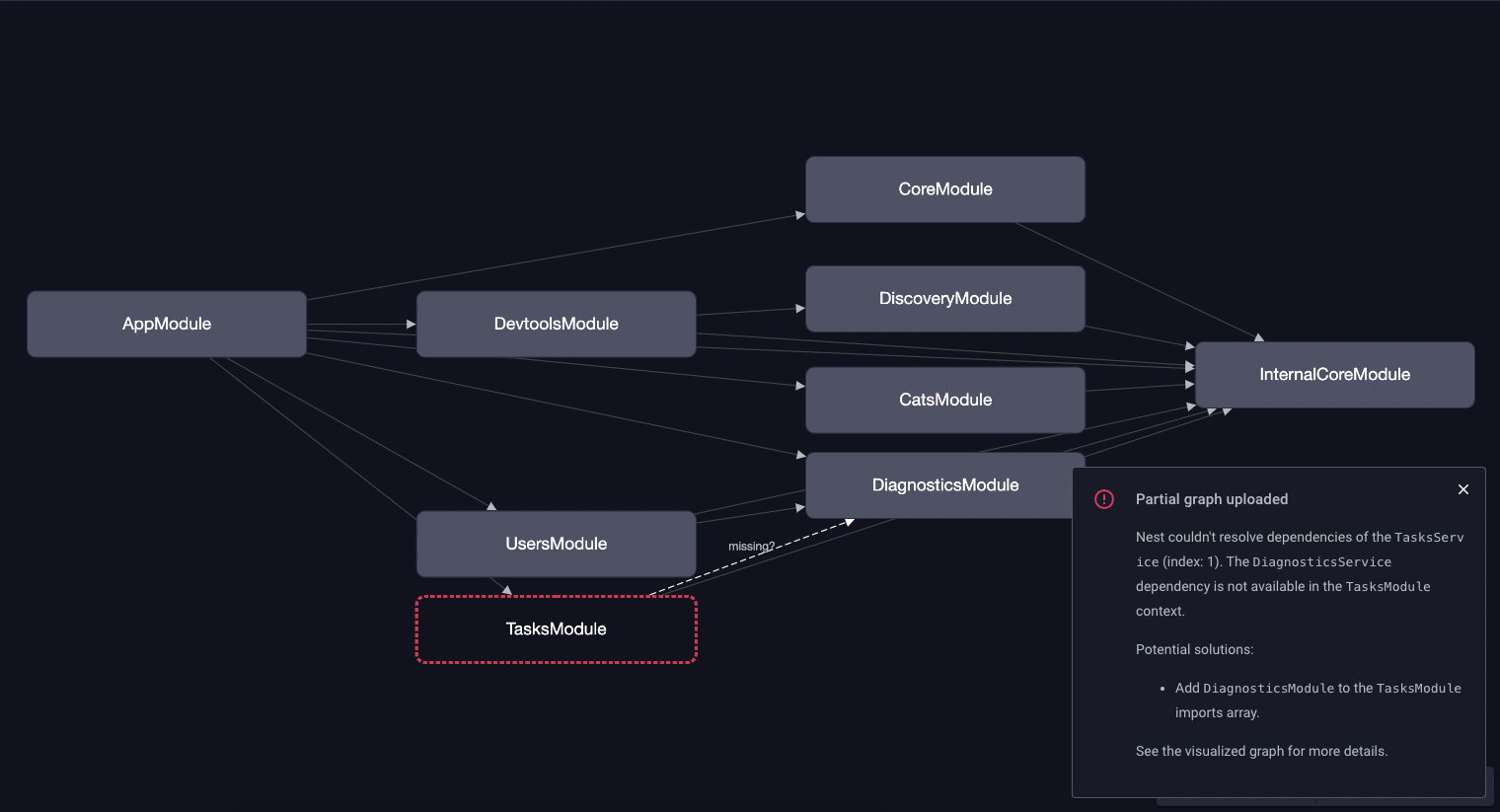 Probably the most common error message you might have seen is about Nest not being able to resolve dependencies of a provider. Using Nest Devtools, you can effortlessly identify the issue and learn how to resolve it.