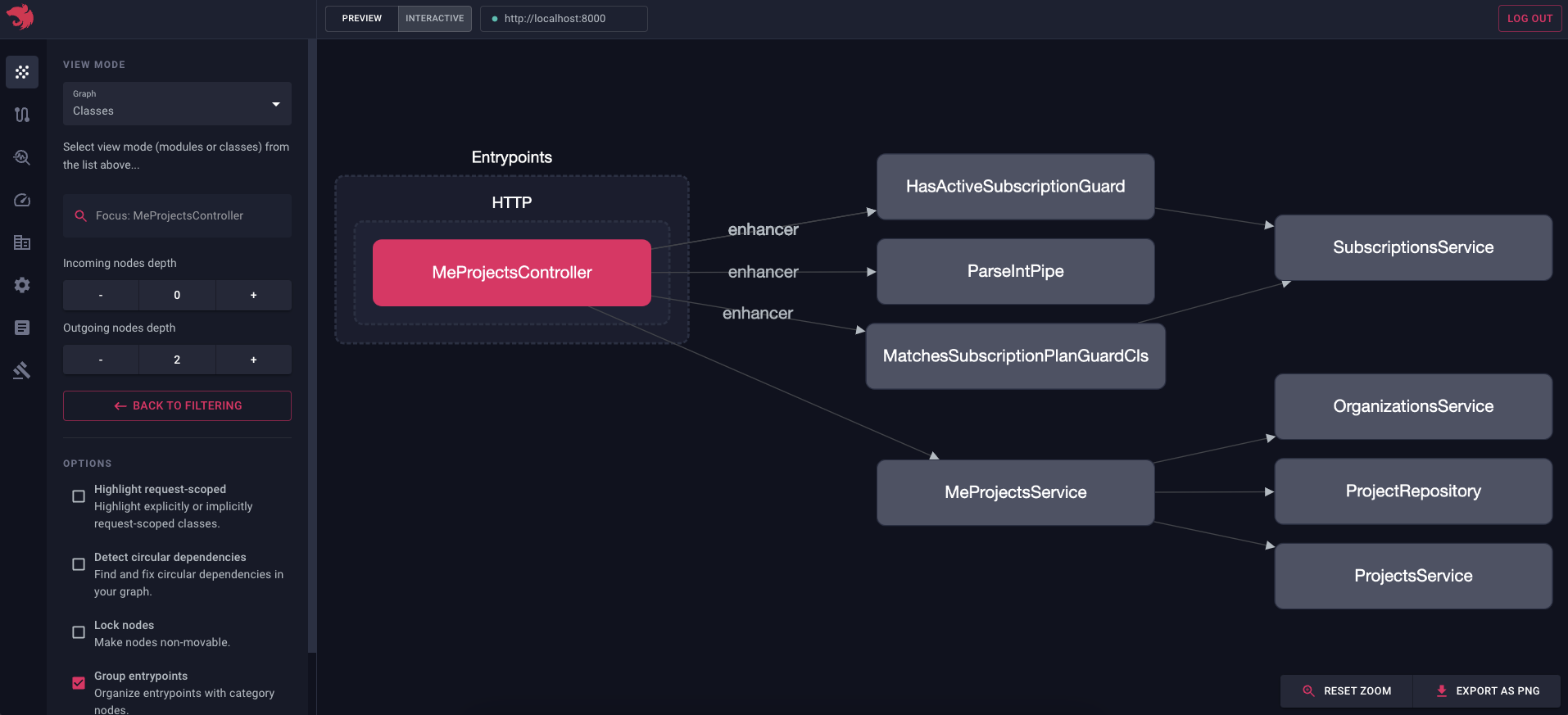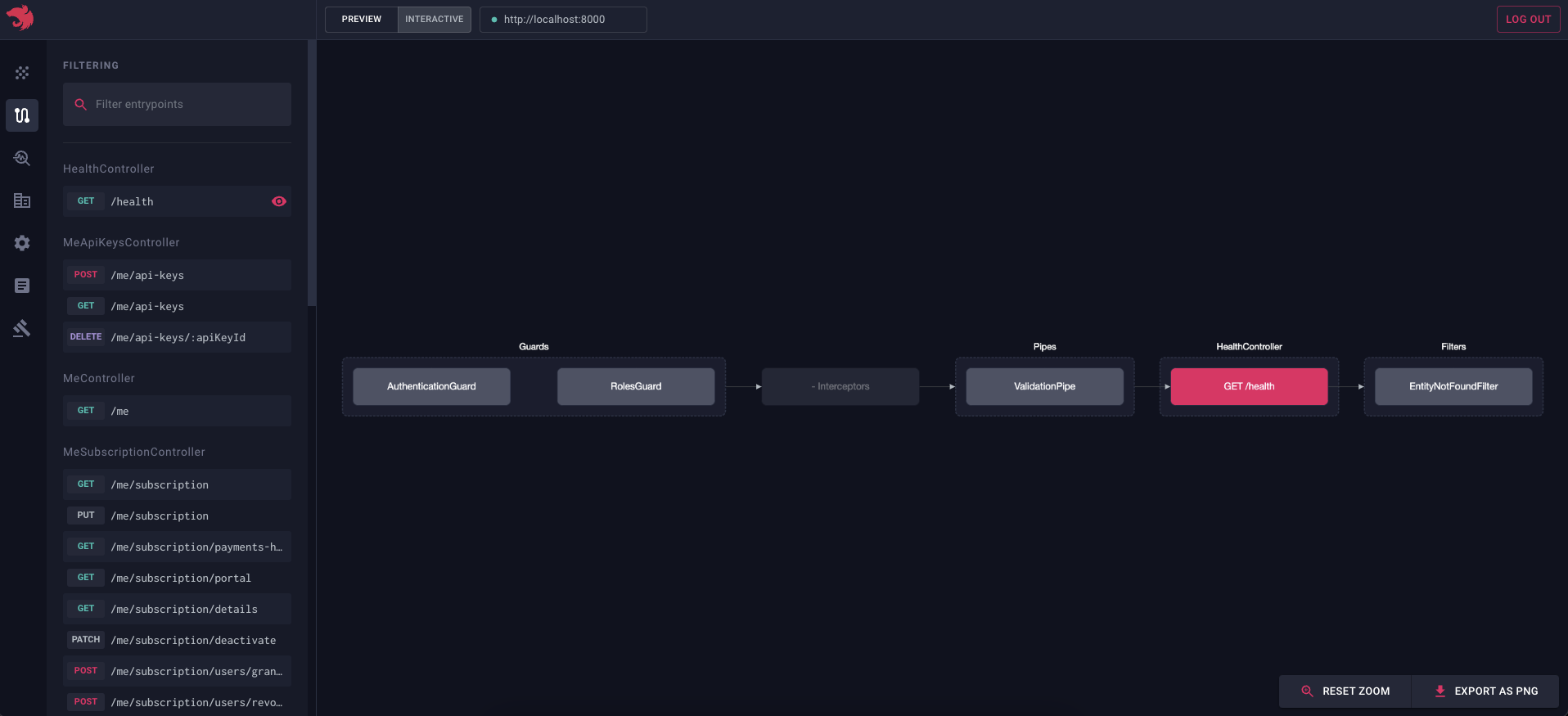 If you click on a specific entrypoint, a flow graph will be displayed. This graph shows the execution flow of the entrypoint (e.g. guards, interceptors, pipes, etc. bound to this route). This is particularly useful when you want to understand how the request/response cycle looks for a specific route, or when troubleshooting why a specific guard/interceptor/pipe is not being executed.