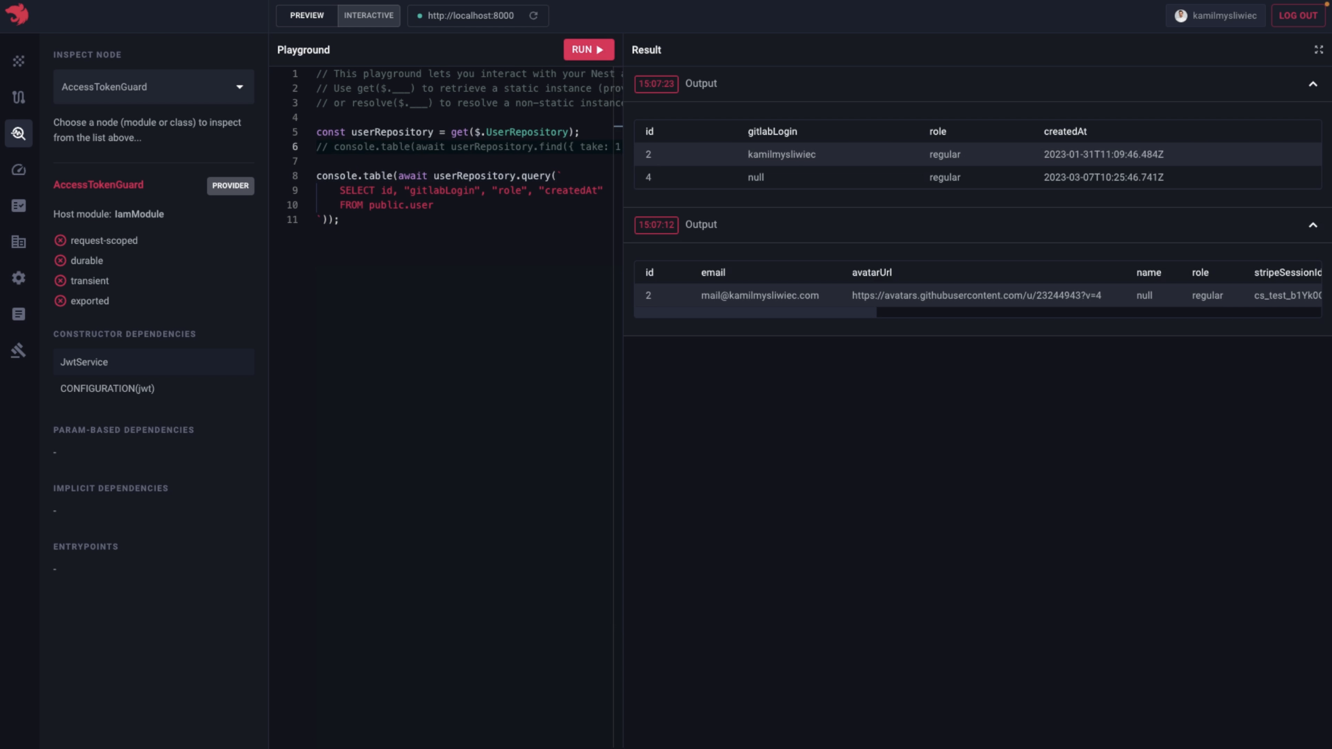 The playground can be used to test and debug API endpoints in real-time, allowing developers to quickly identify and fix issues without using, for example, an HTTP client. We can also bypass the authentication layer, and so we no longer need that extra step of logging in, or even a special user account for testing purposes. For event-driven applications, we can also trigger events directly from the playground, and see how the application reacts to them.